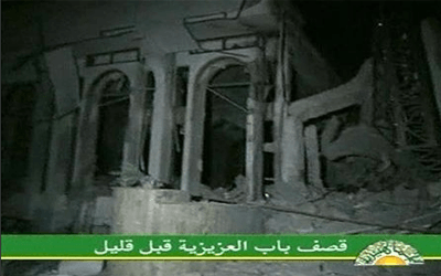 سوت بالارض غارة لحلف شمال الاطلسي مبنى داخل مجمع باب العزيزية مقر الزعيم الليبي معمر القذافي في ساعة مبكرة من صباح يوم الاثنين فيما وصفته مسؤولة صحفية من حكومة القذافي بانها محاولة لاغتياله.
