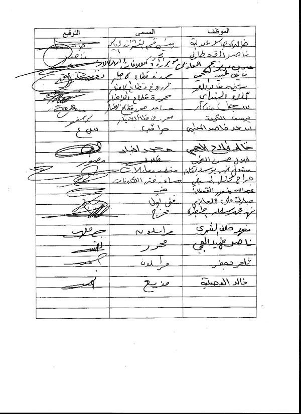 لم نكن يوما نتصور في كويتنا الشامخة ان نشتكي فيها من العنصرية وتمزيق الوحدة الوطنية وزرع الفتنة في نسيجنا الاجتماعي والمهني .. ولكننا اجبرنا معالي الوزير على كتابة هذه العريضة نرجوكم فيها ان تتفهموا عدم قدرة الموقعين ادناها على العمل مع السيد الوكيل المساعد لقطاع الاخبار ..