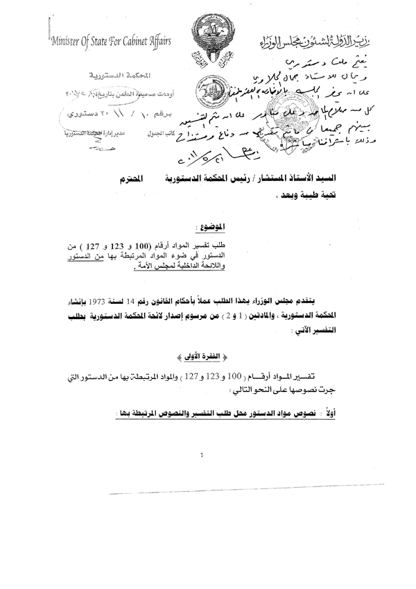 تنفرد ((سبر)) بنشر المذكرة التي تقدمت بها الحكومة عن طريق وزير الدولة لشؤون مجلس الوزراء علي الراشد إلى المحكمة الدستورية من أجل طلب تفسير بعض مواد الدستور المتعلقة باستجواب رئيس مجلس الوزراء المقدم من قبل النائبين أحمد السعدون وعبدالرحمن العنجري، بالإضافة إلى مذكرة بالرأي القانوني مقدمة من قبل مجلس الأمة، عن طريق النائبين حسين الحريتي وعبدالله الرومي.