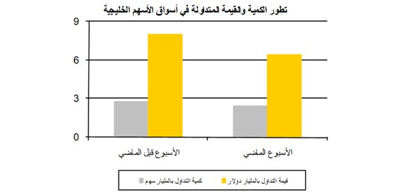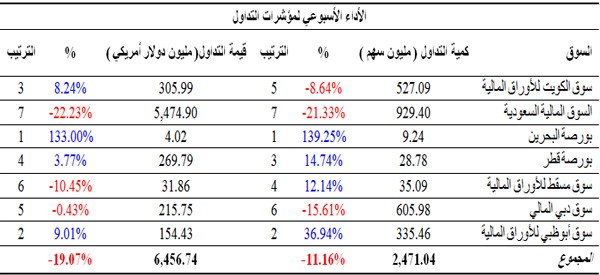 على صعيد الكمية المتداولة، ارتفعت في أربعة أسواق مقابل تراجعها في الأسواق الثلاثة الباقية، وجاءت بورصة البحرين في مقدمة الأسواق التي سجلت نمواً، حيث زاد حجم التداول فيها بنسبة كبيرة بلغت 139.25%. فيما جاء سوق أبوظبي للأوراق المالية في المرتبة الثانية بارتفاع نسبته 36.94%. في حين شغلت بورصة قطر المرتبة الثالثة بنمو نسبته 14.74%. هذا وكان سوق مسقط للأوراق المالية هو الأقل زيادة من حيث حجم التداول خلال الأسبوع، حيث نمت كمية الأسهم المتداولة فيه بنسبة بلغت 12.14%.