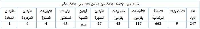 *9 استجوابات،662 سؤالاً و27 لجنة تحقيق و117 اقتراحاً للمجلس و42 مشروعاً للحكومة