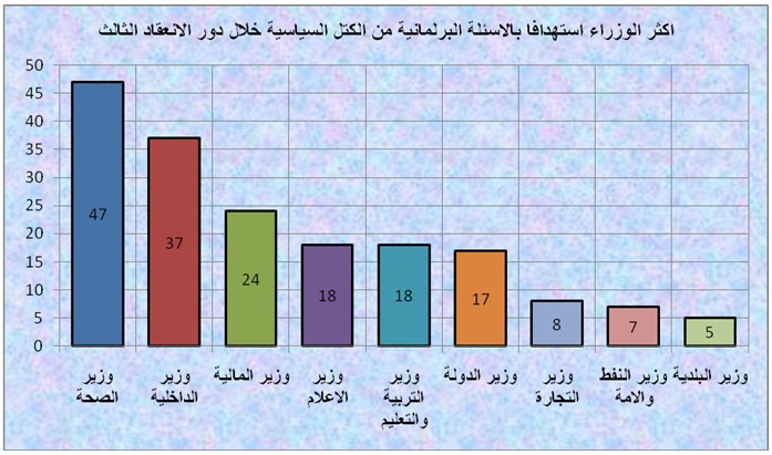 واوضح اتجاهات في سياق تقريره ان كتلة التنمية والاصلاح هي الاكثر نشاطا برلمانيا طبقا لمتوسط مساهمات كل نائب بالاعمال البرلمانية خلال دور الانعقاد الثالث كما ان وزراء الصحة والداخلية والمالية هم الاكثر استهدافا من الكتل طبقا للاسئلة البرلمانية التي وجهت اليهم وجاء تجمع النواب الشيعة في الترتيب الأخير بمتوسط مساهمات كل نائب, بينما ساهم نواب الشعبي بـ 343 عملاً برلمانياً ووقّعوا 4 مرات على كتابي عدم التعاون.