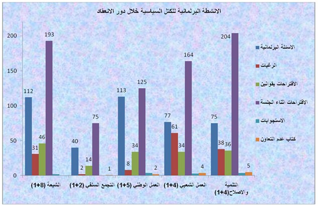 وعلى صعيد مساهمة الكتل البرلمانية في الأنشطة البرلمانية من اسئلة واستجوابات وطلبات طرح الثقة واقتراحات بقوانين ورغبات اقتراحات أثناء الجلسة جاء نواب الشيعة (8+1 نواب) أولاً، يليهم التنمية والإصلاح (4+1) ثم العمل الشعبي (4+1)، فالعمل الوطني (5+1)،وأخيراً التجمع السلفي (2+1)، وفق الأرقام المجردة جاء نواب الشيعة أولاً من حيث الإسهام في الأنشطة البرلمانية ثم التنمية فالشعبي فالعمل الوطني،وأخيراً التجمع السلفي،لكن نظراً أن عدد أعضاء كل كتلة وقوي سياسية تختلف عن الكتلة الأخري ومن ثم تصبح المقارنة غير منطقية لذلك يختلف ترتيب اداء وأسهام الكتلة من خلال قياس متوسط أسهام كل عضو في الأعمال البرلمانية ،وعلى هذا الأساس  فقد ساهم أعضاء كتلة التنمية والإصلاح في 362 عملاً بمتوسط 72.6 عملاً لكل عضوا وهو يضعهم في الترتيب الأول نظراً لأن الكتلة تضم 5 أعضاء ومعهم هايف (4+1) في حين نواب الشيعة 9 أعضاء (8+1) ومتوسط إسهام كل عضو منهم يصل إلى 42.7% وهذا المتوسط يضعهم في الترتيب الأخير،وجاء ثانياً بعد التنمية  كتلة العمل الشعبي (4+1) بمتوسط 68.8% يليها كتلة العمل الوطني (5+1) حيث جاءت ثالثا بمتوسط 48 عملاً برلمانياً لكل عضو،وحل رابعاً التجمع السلفي (2+1) بمتوسط 44 عملاً برلمانياً وأخيرا في المرتبة الخامسة نواب الشيعة،وفي قراءة تفصيلية لأعمال كل كتلة يتضح الآتي: