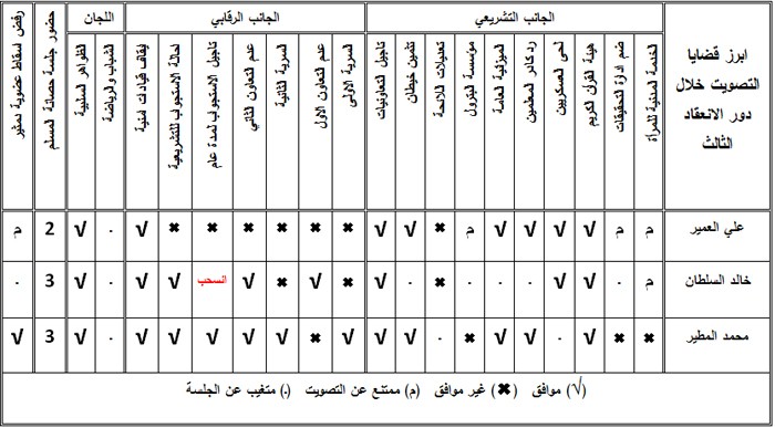 واوضح “اتجاهات” ان نواب التجمع الثلاثة وافقوا مجتمعين على هيئة القرأن الكريم وتاجيل التعاونيات. بينما صوت كلا من علي العمير ومحمد المطير بالموافقة على رد كادر المعلمين والميزانية العامة وتثمين خيطان مع تغيب النائب خالد السلطان عن التصويتات الثلاثة. في حين اتفق العمير والسلطان على لحى العسكريين بالموافقة وتعديلات اللائحة بالمعارضة في ظل تغيب المطير عن التصويتين.