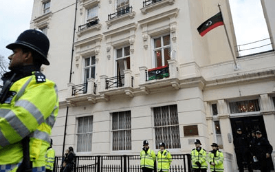 وفتح القائم بالاعمال محمود الناكوع الذي عين على رأس الممثلية الليبية في لندن, رسميا السفارة برفع العلم المثلث الالوان الأسود والأحمر والأخضر يتوسطه هلال.
