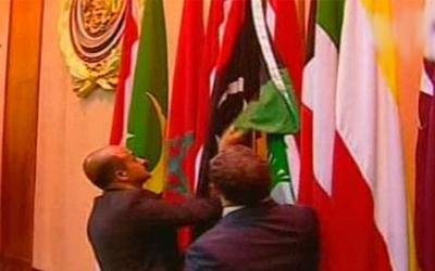 وأفاد صحافي من وكالة فرانس برس بأن علم الاستقلال الليبي الذي اعتمده المجلس الوطني الانتقالي وضع داخل القاعة التي يجتمع فيها الوزراء.