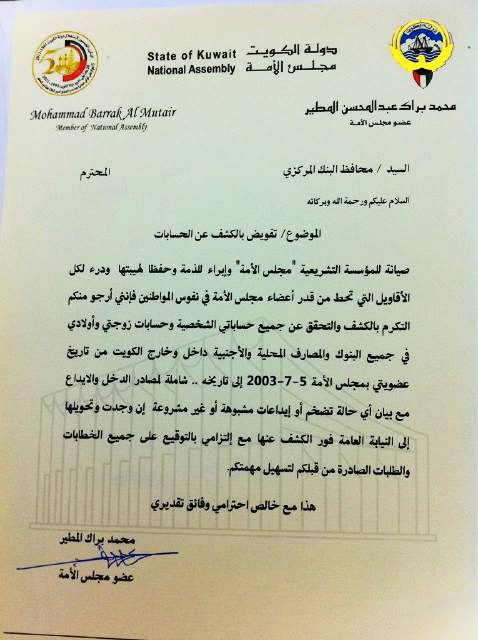 وقال المطير في كتابه المرسل إلى محافظ البنك المركزي: صيانة للمؤسسة التشريعية وابراء للذمة وحفظا لهيبتها ودرءاً لكل الاقاويل التي تحط من قدر أعضاء مجلس الأمة في نفوس المواطنين، فإنني أرجو منكم التكرم بالكشف والتحقق عن جميع حساباتي الشخصية وحسابات زوجتي وأولادي في جميع البنوك والمصارف المحلية والاجنبية داخل وخارج الكويت من تاريخ عضويتي بمجلس الامة في 5 يوليو 2003 وحتى تاريخه، شاملة لمصادر الدخل والايداع مع بيان اي حالة تضخم او ايداعات مشبوهة ان وجدت، وتحويلها الى النيابة العامة فور الكشف عنها، مع التزامي على التوقيع على جميع الخطابات الصادرة من قبلكم لتسهيل مهمتكم.