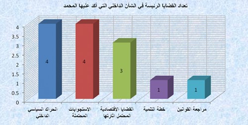 أوضح اتجاهات أن سمو الرئيس ركز خلال تناوله لقضايا الشأن الداخلي على خمس قضايا رئيسة, حققت نسبة 71.1% من إجمالي القضايا الرئيسة المثارة في الحديث الصحفي. وقد فسر المحمد هذه القضايا في ثماني قضايا فرعية حققت نسبة 66.7% مستخدما في ذلك ثلاث عشرة فقرة من أصل تسع عشرة بنسبة 68.4%. وجاء ذلك في 979 كلمة من أصل 1392 وهو ما حقق نسبة 70.3%. وألقى اتجاهات الضوء على تلك القضايا في البنود الآتية: