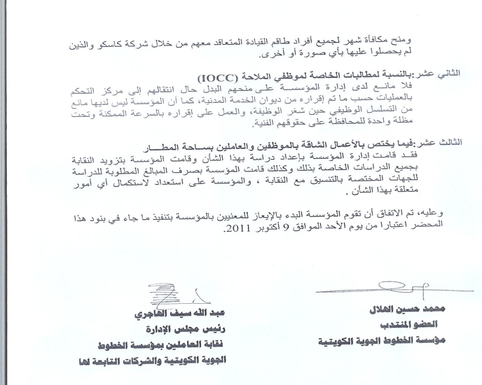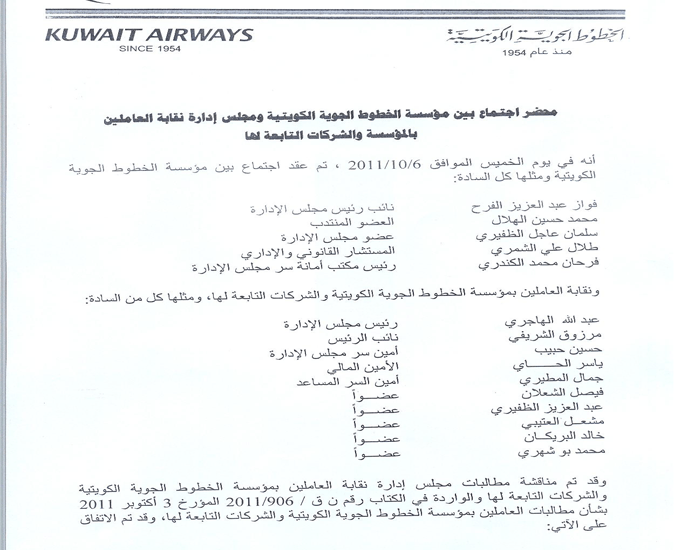هذه “البشرى”، زفّها رئيس مجلس إدارة نقابة العاملين في مؤسسة الخطوط الجوية الكويتية والشركات التابعة لها عبد الله سيف الهاجري لموظفي المؤسسة والشركات التابعة لها، مبيناً أن ما تم الاتفاق والتوقيع عليه مع قيادات المؤسسة تم بإشراف وزير الكهرباء والماء ووزير الإعلام والمواصلات بالوكالة سالم الأذينة “الذي كان معنا من خلال اتصال هاتفي”.
