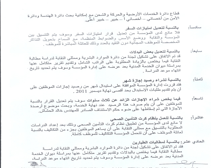 ما تم الاتفاق عليه بين الطرفين تمثل في موافقة “المؤسسة” على 70% من مطالبات النقابة الرئيسية، بينما تنتظر النسبة الباقية (30%) أياماً فقط حتى تصل إلى مرحلة التنفيذ على اعتبار انها تحتاج إلى قرارات من ديوان الخدمة المدنية.