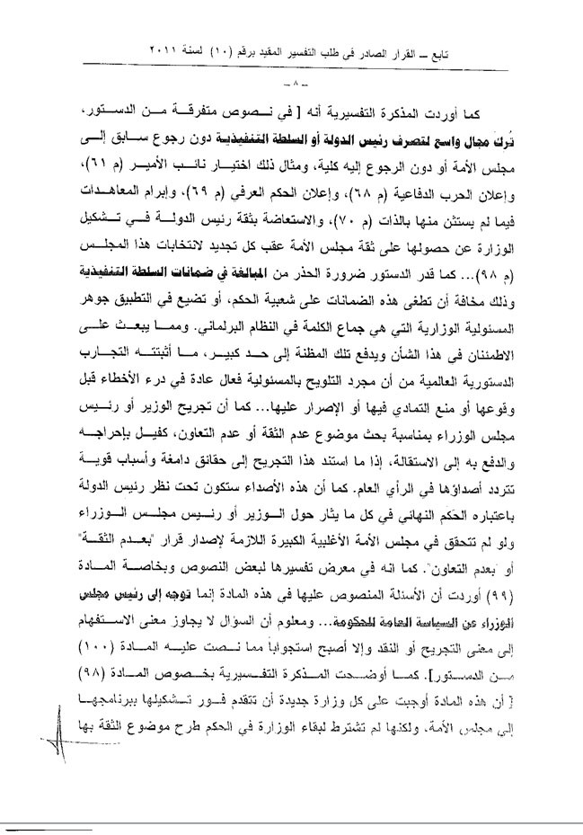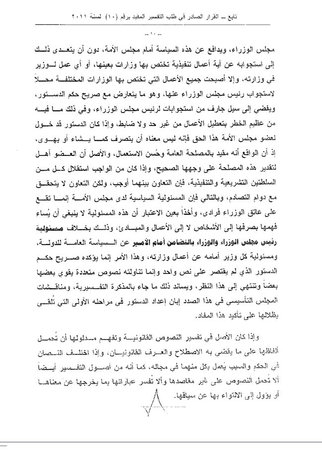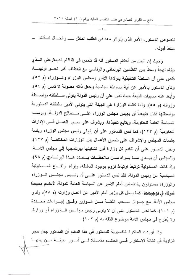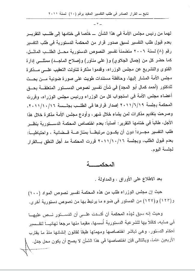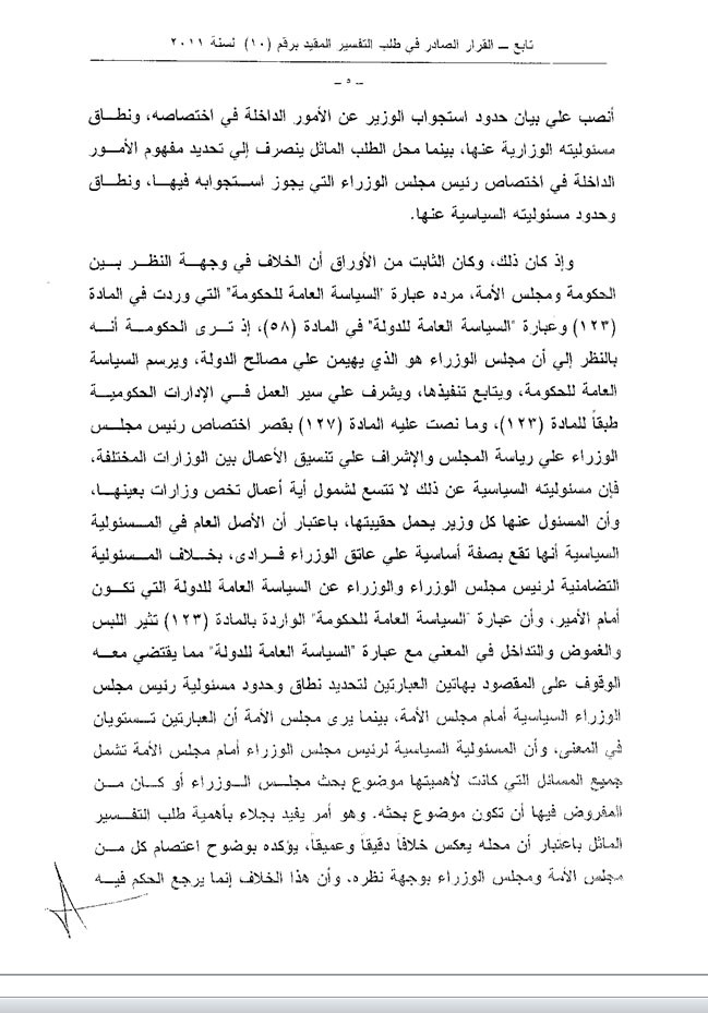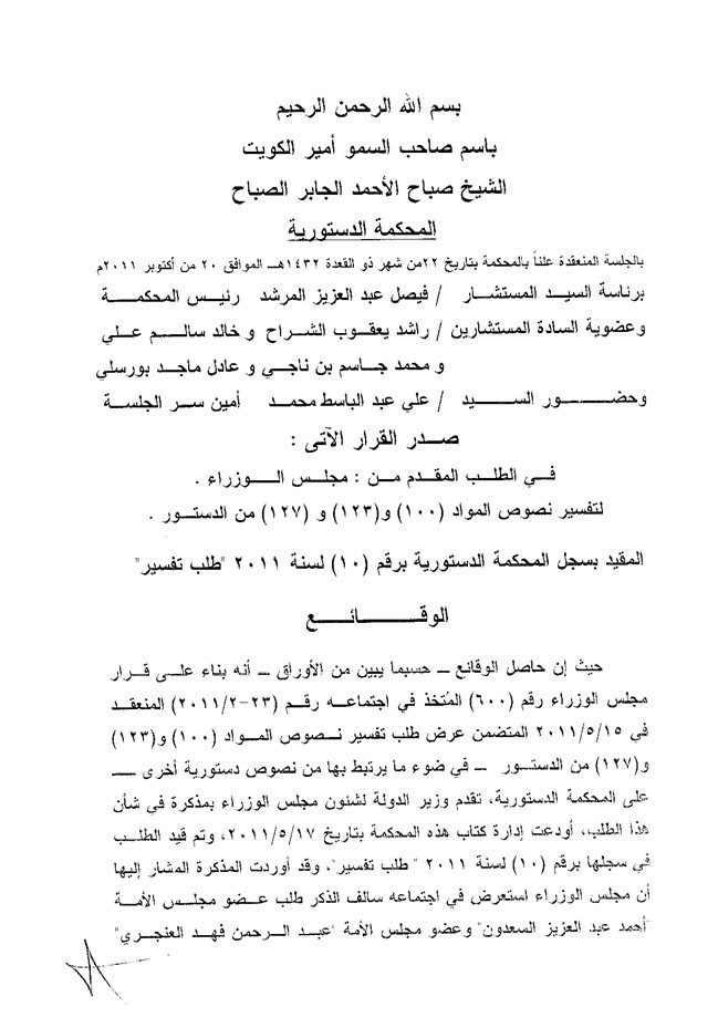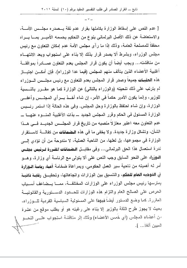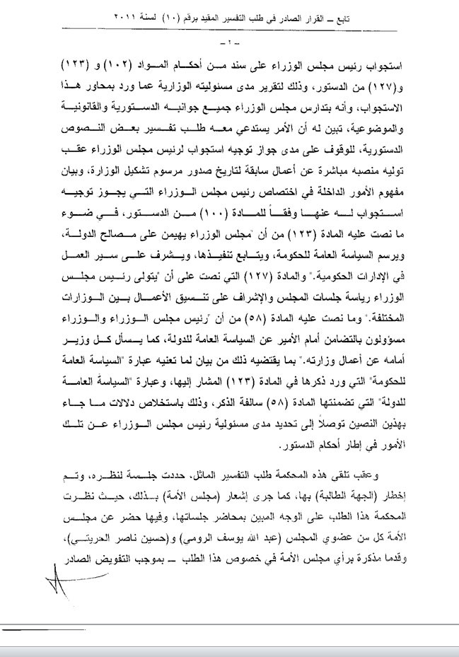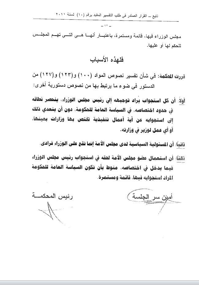 (تحديث2) أكد مستشار دستوري فضل عدم ذكر اسمه أن قرار المحكمة الدستورية لم يتطرق لاستجواب النائبين السعدون والعنجري المقدم لرئيس الوزراء من قريب ولا من بعيد، وأن ما جاء في قرارها إنما هو تأكيد لما هو معلوم مسبقاً من أن رئيس الوزراء يستجوب في السياسة العامة في حين يستجوب كل وزير في ما يخص أعمال وزارته. ولم يأتِ في قرارها ما يشير صراحة إلى عدم دستورية الاستجواب المذكور.