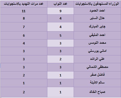 أعد مركز “اتجاهات” للدراسات والبحوث الذي يترأسه خالد عبدالرحمن المضاحكة تقريرا علميا رصد فيه بشكل موضوعي مواقف واتجاهات النواب خلال الفترة الماضية, واكد ان ثمانية عشر نائبا قاموا بتوجيه تهديدات بتقديم استجوابات مباشرة لـ “11” وزيراً في حكومة المحمد السابعة.