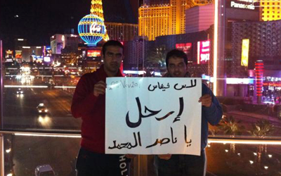 هذه المرة من “لاس فيغاس” في الولايات المتحدة الأمريكية.. حيث رفع شابان كويتيان يتواجدان هناك لوحة كتبت فيها عبارة “إرحل يا ناصر المحمد”.. بالشكل الذي يعكس حجم الاستياء العام لدى قطاع عريضمن الشعب الكويتي، الذي بات يحمل معه هم وجود حكومة ناصر المحمد التي قادت بدورها البلاد من سيء أسوأ منذ العام 2006.