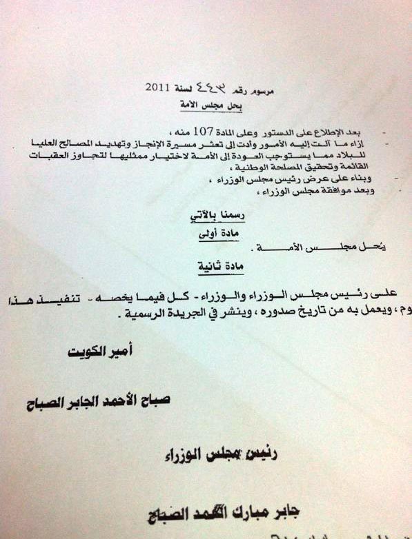 علمت ((سبر)) أن مرسوم حل مجلس الأمة صدر وسيذاع عصر اليوم دون توجيه خطاب في هذا الشأن.
