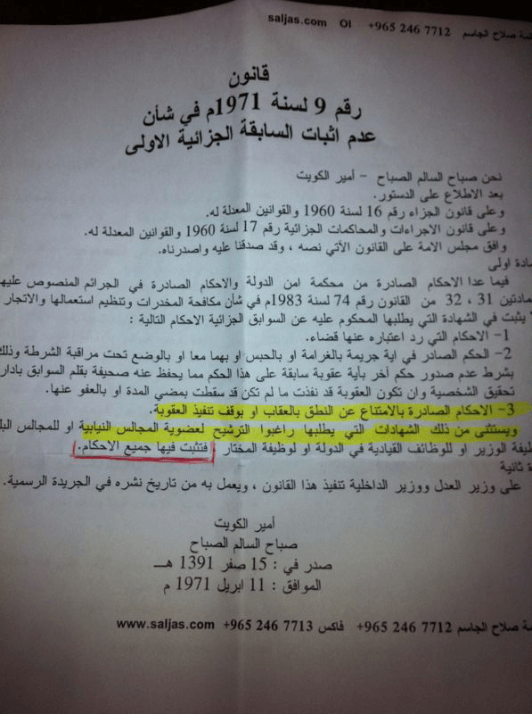 فقد أوضح قانون رقم 9 لسنة 1971 في شأن عدم إثبات السابقة الجزائية الأولى في مادته الأولى أن الشهادة التي يطلبها المحكوم عليه عن السوابق الجزائية، فيما عدا الأحكام الصادرة من محكمة أمن الدولة والأحكام الصادرة في الجرائم المنصوص عليها في المادتين 31، 32 من القانون رقم 74 لسنة 1983 في شأن مكافحة المخدرات وتنظيم استعمالها والاتجار بها، الأحكام التالية:
