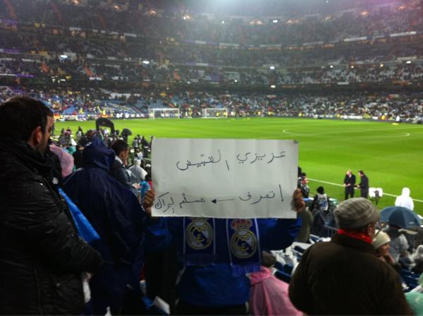 أحد الكويتيين الحاضرين لمواجهة (كلاسيكو الأرض) بين ريال مدريد وبرشلونة رفع لافتة كتب عليها (عزيزي القبيض .. تعرف مسلم البراك).
