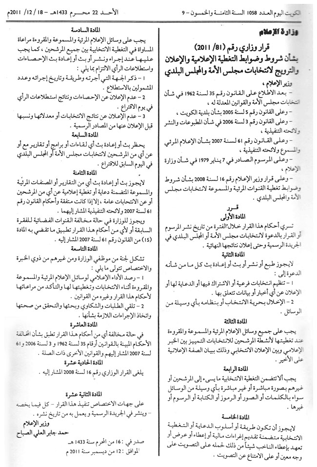 أصدرت وزارة الإعلام قرارًا يهتم بشروط وضوابط التغطية الإعلامية لانتخابات مجلس الأمة القادمة؛ إذ تسري أحكامه فور نشر مرسوم الدعوة إلى الانتخابات في الجريدة الرسمية.