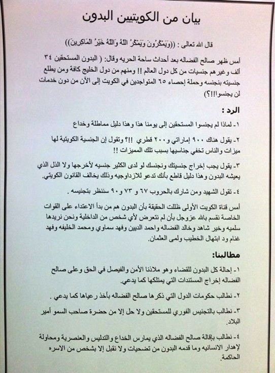 وطالب البيان بإحالة كل البدون الذين ادعى الفضالة أنهم يخفون جنسياتهم إلى القضاء الكويتي، كما طالب بإقالة الفضالة لكونه يمارس الخداع والتدليس والعنصرية ووضع رجل من الأسرة الحاكمة بدلاً منه.
