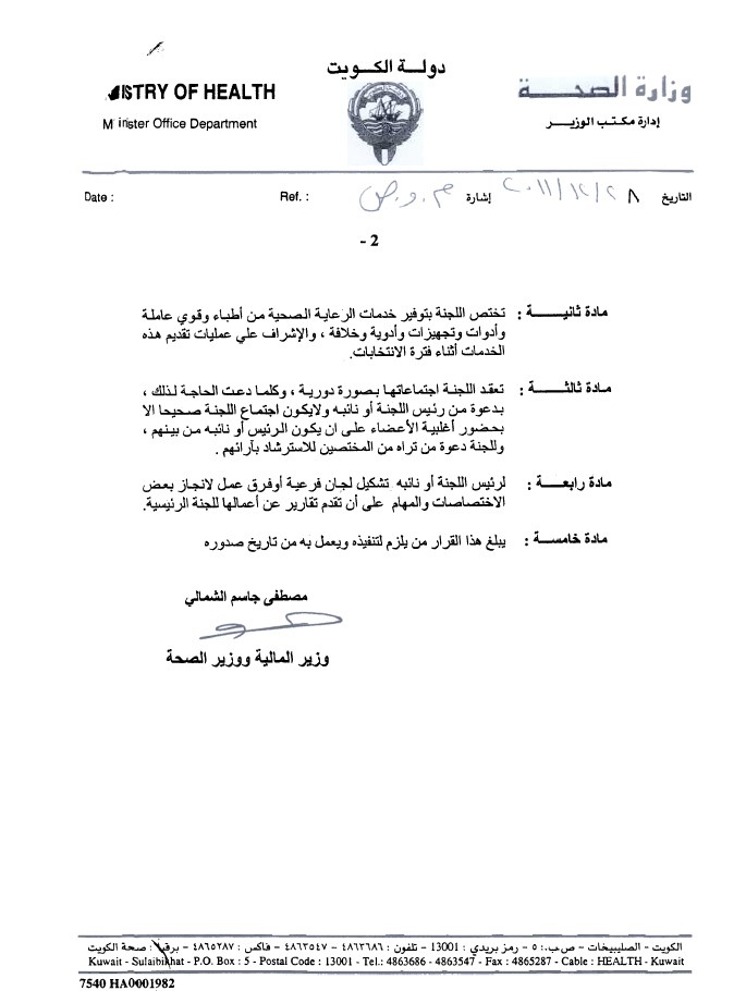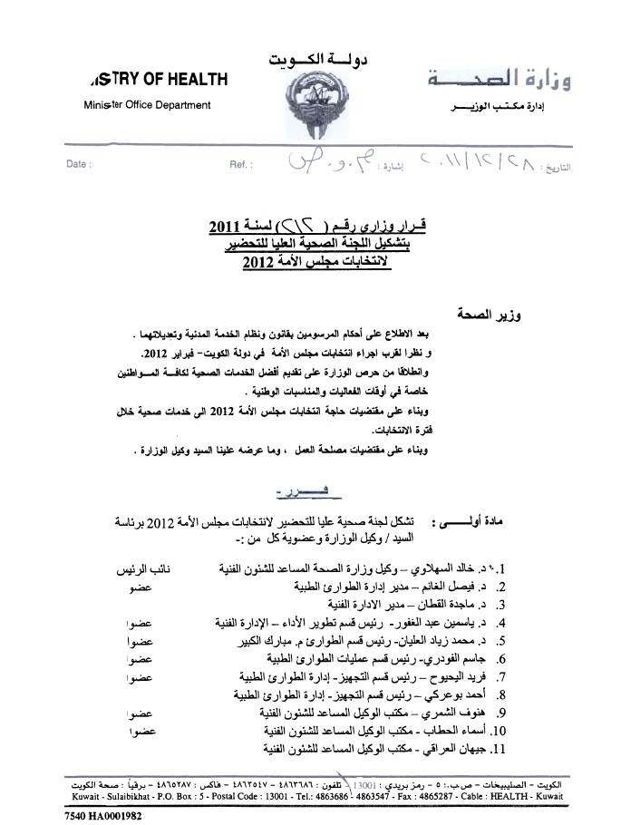 أصدرت وزارة الصحة قراراً وزارياً بتشكيل لجنة صحية عليا للتحضير لانتخابات مجلس الامة المقبلة, وجاء ذلك القرار بعد الاطلاع على أحكام المرسومين بقانون ونظام الخدمة المدنية وتعديلاتهما.