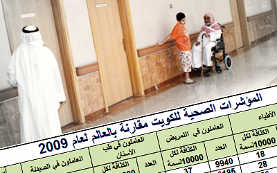 يوجد في الكويت الغنية  18 طبيب فقط لكل 10 ألاف نسمة وبالرغم من أن قيمة المؤشر في الكويت أفضل من المتوسط العالمي البالغ 14 طبيب لكل 10 آلاف نسمة إلا أن وضع الكويت أسوا بكثير من الحد الأعلى العالمي البالغ 64 طبيب وكذلك اقل من مستوى المؤشر في دولة خليجية مثل قطر (28) ودول عربية متوسطة الدخل مثل الأردن ومصر ( 26و24) واقل بكثير من دولة إسلامية مثل أذربيجان (38) واقل بقليل من دولة متقدمة مثل كندا (19).