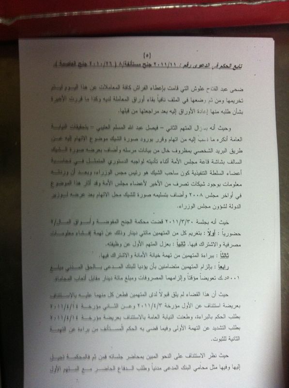 (تحديث) أيدت محكمة الجنح المستأنفة برئاسة المستشار عادل الصقر حكم أول درجة القاضي بتغريم النائب السابق فيصل المسلم 200 دينار عن تهمة إفشاء أسرار مصرفية في قضية الشيكات المرفوعة من بنك برقان، كما أيدت براءة موظف البنك من تهمة خيانة الأمانة.