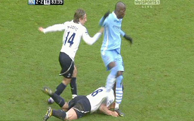 وكان “بالوتيللي” قاد مانشستر سيتي للفوز على توتنهام 3-2، بهدف سجله الإيطالي في الوقت بدل الضائع من ركلة جزاء انتزعها من “ليدلي كينغ”، إلا أنه لم يكن يستحق مواصلة المباراة حتى ثوانيها الأخيرة، لأن الحكم لم يتنبه إلى أن لاعب انتر ميلان السابق، داس عمدًا على رأس “سكوت باركر”، عندما قام الأخير بصد تسديدة الإيطالي قبل أن يسقط اللاعبان أرضًا، وذلك في الدقيقة 83 من المباراة.