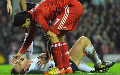 “سواريز” دخل كبديل.. في أول مباراة له، بعد انتهاء فترة إيقافه لثماني مباريات، لتوجيهه عبارات عنصرية إلى الفرنسي “باتريس إيفرا” مدافع مانشستر يونايتد، إلا أنه سرعان ما ارتكب مخالفة غير رياضية، بركله لاعب وسط توتنهام “سكوت باركر” في بطنه، علمًا بأن الأخير كان أيضًا ضحية لمهاجم مانشستر سيتي الدولي الايطالي “ماريو بالوتيللي” الذي داس على رأس لاعب توتنهام، دون أن يتنبه له الحكم، لكن الاتحاد الانجليزي شاهد شريط اللقاء، وأوقفه لأربع مباريات.