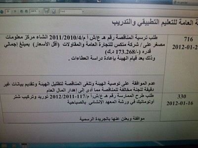 وكشف العجمي عن “فضيحةخطيرة تتمثل في رفض مناقصة للتطبيقي، حيث كتب في موقع لجنة المناقصات أن سبب الرفض هو “تضليل الهيئه وتقديم بيانات غير دقيقه للجنة مما أدى الى أهدار المال العام”، مضيفاً أن القصة تتلخص في أن إدارة الحاسب الآلي طلبت تأسيس مركز معلومات في منطقة الشويخ بمبلغ 173 ألف دينار، ووقتها حذرت النقابة من أن مثل هذه المناقصة غير لازمة ولا نحتاجها وتم إيقافها، لكن مسؤولي إدارة الحاسب الآلي وادارة التوريدات نجحوا في تمريرها وترسيتها على نفس الشركه التي رفضت في السابق، ما يعد فضيحة بكل ماتعنيه الكلمة وإساءة بالغة للهيئة.