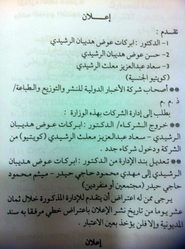 توابع إيقاف صحيفة الدار يبدو أنها امتدت إلى جريدتي “الصباح” و”الحرية” وإن لم ينتج عنه توقف هاتين الجريدتين عن الصدور حتى الآن، فقد أعلن في “الكويت اليوم” عن خروج د.بركات هديبان الرشيدي من شركة الاخبار الدولية (المالكة لهما) ودخول شريكين جديدين هما مهدي محمود حيدر وميثم محمود حيدر.