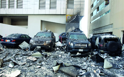 بعد سماع جرس إنذار الحريق فوجئت 408 عائلة وهم سكان بناية سكنية مكونة من 40 طابقاً بمنطقة النهدة بالشارقة بالنيران تشتعل في الطابق الأول من البناية لتمتد إلى الطوابق العليا كافة، وعلى الفور هرعوا إلى الخيام التي أقامتها الشرطة وجمعية الشارقة الخيرية، وتسببت النيران في أضرار لحقت بـ102 شقة، بالإضافة إلى تضرر 45 سيارة، من دون خسائر بشرية أو إصابات.