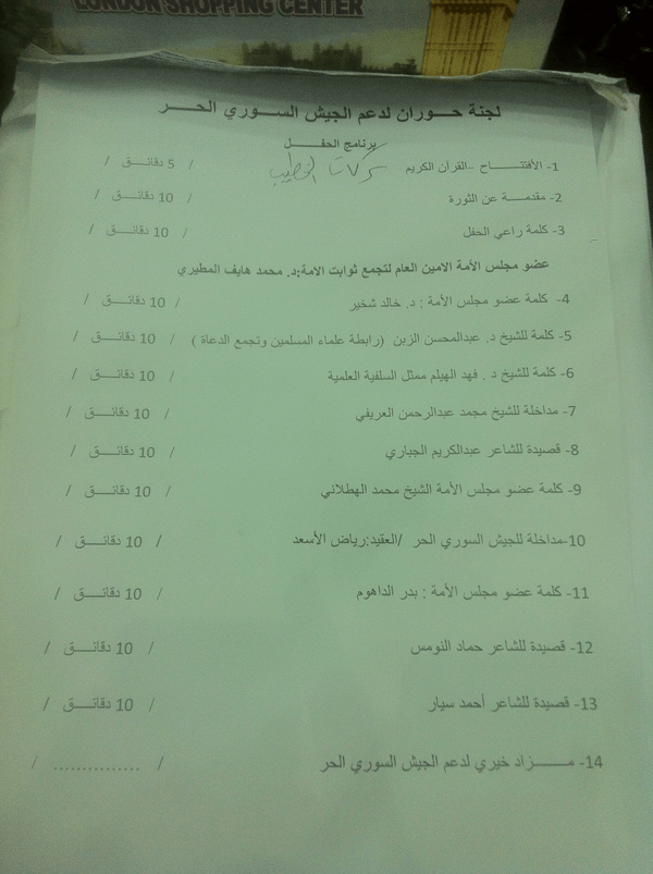 تحت شعار”قتربت ساعة الصفر” يقيم الآن نادي النصر الرياضي المهرجان الخطابي لنصرة الشعب السوري بصالة شيعان عبدالرحمن المطيري برعاية تجمع ثوابت الأمة ولجنة حوران للإغاثة ، في حضور كل من النواب محمد هايف المطيري ومحمد الهطلاني وبدر الداهوم وخالد شخير ونائب المجلس البلدي السابق ماجد موسى المطيري والناشط السياسي فهيد الهيلم والشاعر عبدالكريم الجباري.