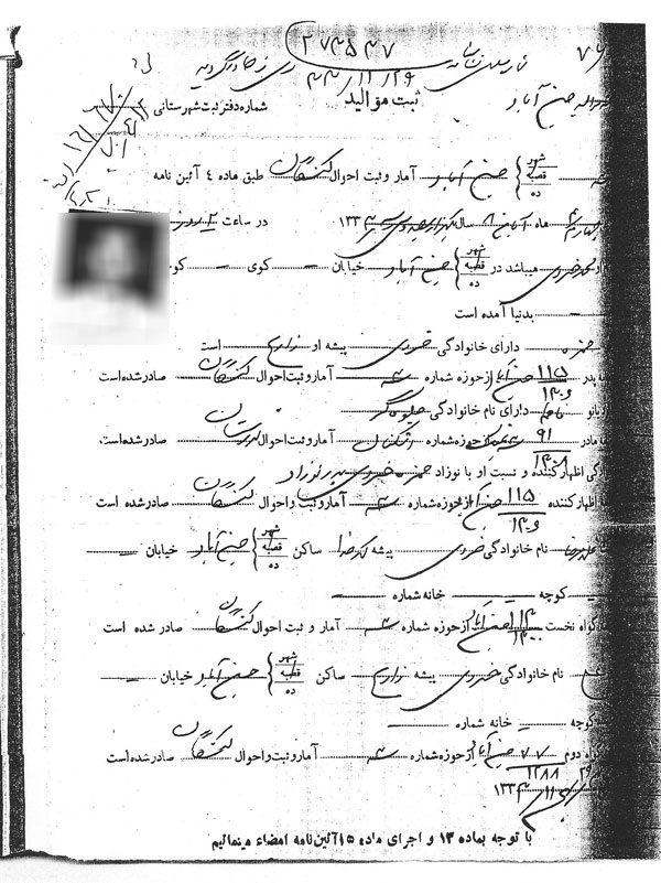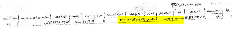 صورة جنسيته وبطاقته الإيرانيتين – نعتذر لرداءة الصورة من المصدر – وفيهما يظهر “تاريخ تولد” أي تاريخ الميلاد، و”نام” أي الإسم، و”نام بدر” أي اسم الأب، و”نام خانوادكي” أي اسم العائلة