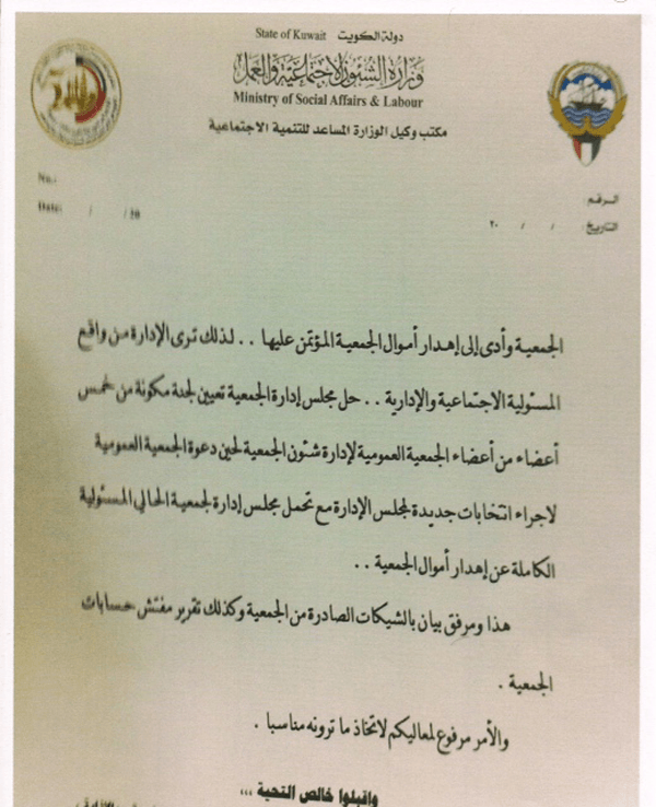 وقال الخباز: ” كان من المقرر رفع مذكرة قانونية من إدارة الجمعيات الأهلية لوزير الشئون الاجتماعية بالأسبوع الماضي إلا أن شيئا خلف الكواليس حدث بإرجاع هذه المذكرة التي أشارت في ختماها أنه “وبعد إهدار أموال الجمعية الطبية المؤتمن عليها لذلك ترى إدارة الجمعيات الأهلية من واقع المسئولية الاجتماعية والإدارية حل مجلس إدارة الجمعية وتعيين لجنة مكونة من خمس أعضاء من أعضاء الجمعية العمومية لإدارة شئون الجمعية لحين دعوة الجمعية العمومية لإجراء انتخابات جديدة لمجلس الإدارة مع تحمل مجلس إدارة الجمعية الحالي المسئولية الكاملة عن إهدار أموال الجمعية، هذا ومرفق بيان بالشيكات الصادرة من الجمعية وكذلك تقرير مفتش الحسابات”.