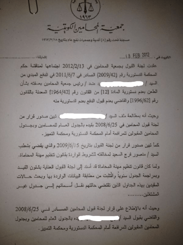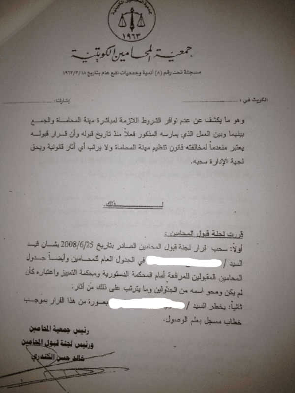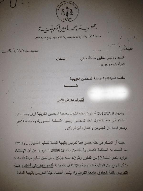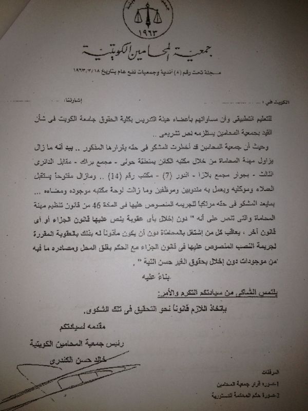 وقال رئيس الجمعية خالد حسن الكندري ان عضو التدريس كان مقيدا في الجمعية ،ثم تبين للجنة القبول انه مخالف للشروط اذ ان قانون تنظيم مهنة المحاماة يجيز ممارسة المهنة من قبل عضو هيئة التدريس في كلية الحقوق جامعة الكويت فقط، وبما ان المشكو في حقه عضو هيئة تدريس في التطبيقي فلا يجوز له ممارسة المهنة، وعليه تم شطبه من جدول المحامين بالجمعية ، فأصر على ممارسة المهنة ومكتبه مفتوح للعملاء.