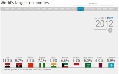 وجاءت المملكة العربية السعودية في المرتبة الثامنة بنسبة نمو متوقعة تعادل 6.0%، وقطر في المرتبة التاسعة بمعدل 6.0%، فيما كانت العراق في المرتبة الأولى بنمو يتوقع أن تعادل نسبته 11.2% في 2012.