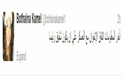 وقالت كامل عبر تغريدة على حسابها الخاص على “تويتر” مساء اليوم الأربعاء: “آخر المعلومات اتفاق الإخوان مع العسكر علي ان يكون شفيق رئيساً”.