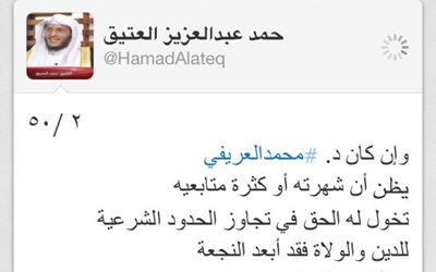 وقال الشيح حمد من حسابه على التويتر: “لقد تجاوز د.?محمدالعريفي? حده فليتحمل تبعة ذلك ولاحول ولاقوة إلا بالله وليعلم وأمثاله أن دون هذا البلد أرواحنا ونحورنا، وإن كان د.العريفي? يظن أن شهرته أو كثرة متابعيه تخول له الحق في تجاوز الحدود الشرعية للدين والولاة فقد أبعد النجعة”.