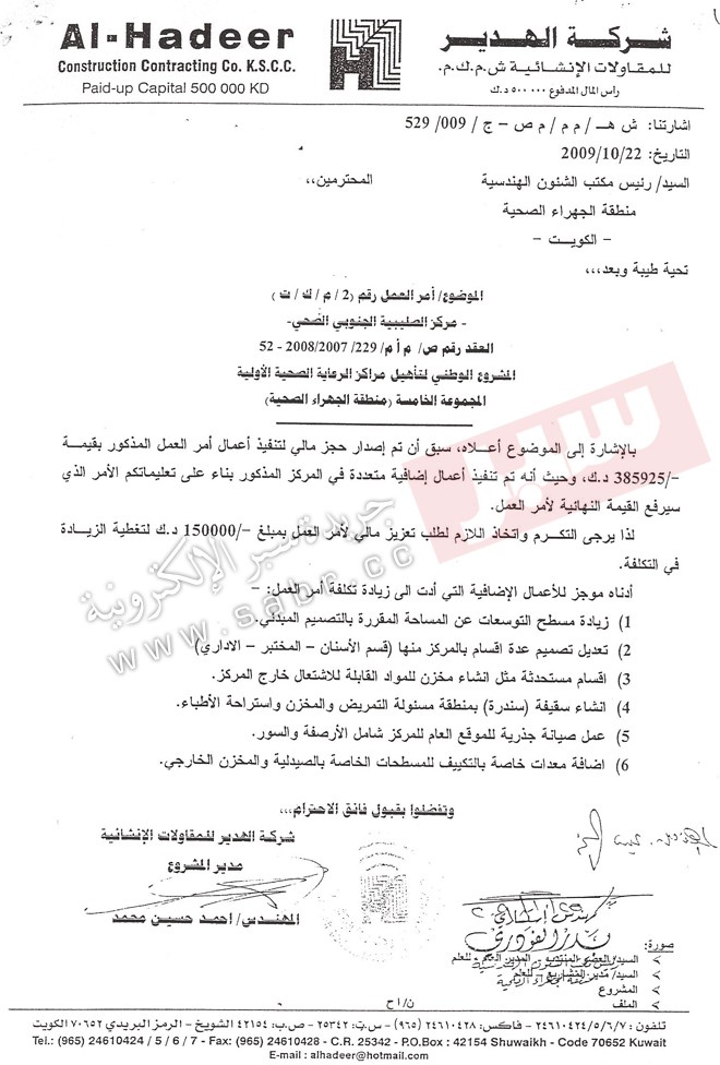 حيث جاء في كتاب الشركة المنفذة والصادر بتاريخ 22/10/2009 والقاضي بقيامها العمل على تنفيذ مجموعة من الاعمال الاضافية على العقد ، وبناء على هذا الكتاب فقد قام المسؤولون بالمنطقة بمخاطبة الجهات المختصة بتاريخ 15/11/2009 بطلب تعزيز مالي لتلك الاضافة ، اي ان الشركة نفذت أعمالها بموافقة مسؤولي الجهراء قبل مخاطبة الجهات المعنية بالوزارة ، مما يعتبر تجاوزا صريحا على قانون آخر من قوانين ديوان المحاسبة الامر الذي يؤكد حدوث شبهة تعدي على حرمة الاموال العامة خصوصا اذا ما علما ان مجمل ما جاء في بنود الاوامر التغييرية التي اضافتها الشركة هي من البنود المذكوره في العقد الاساسي .