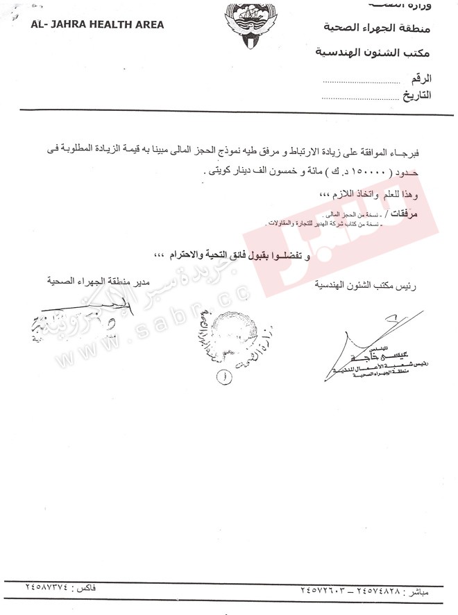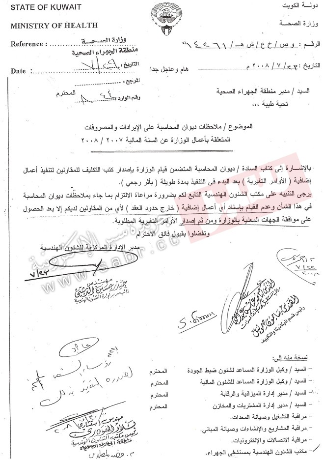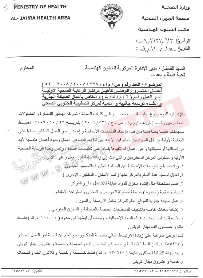 أما التجاوز الثاني فهو مخالفة الشركة والمسؤولين في المنطقة الصحية للتعميم الصادر من ديوان المحاسبة والذي أكدت علية الوزارة بعدم القيام بإسناد اي اعمال اضافية على العقود المبرمة مع الشركات الا بعد الموافقة من قبل الجهات المعنية بالوزارة واصدار الاوامر التغييرية ، وهنا يتجلى واضحاً خرق قانون الجهات الرقابية من خلال المراسلات والكتب التي تمت بين المسؤولين في منطقة الجهراء الصحية والوزارة .