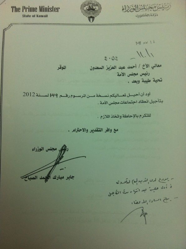 شايع الشايع: هذا حق صاحب السمو وندعو الله ان يحفظ الكويت وقراره علي العين والرأس وسمعا وطاعة لصاحب السمواما تعديل الدوائر وحل المجلس وتشكيل الحكومة فهذا شئ اخر لم نسمع به.
