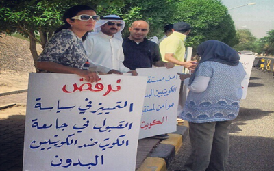 استنكرت مجموعة 29 التمييز الواضح الذي تنتهجه إدارة الجامعة تجاه المتقدمين البدون للالتحاق بكلياتها المختلفة وذلك خلال اعتصامها الصامت الذي اقامته لليوم الخامس على التوالي امام صالة القبول والتسجيل في الجامعة.