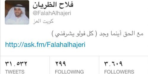 المغرّد الرابع.. “فلاح الظريان” الذي أبدى إعجابه بكتلة العمل الشعبي، مبديًا إعجابه بثبات مواقفها والصدق في مبادئها.. وأكّد بأن الحكومة المنتخبة هي المشكلة التي تشغله ضمن القضايا المحلية، وأنها الحل لجميع المشاكل العالقة في الساحة السياسية.