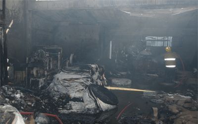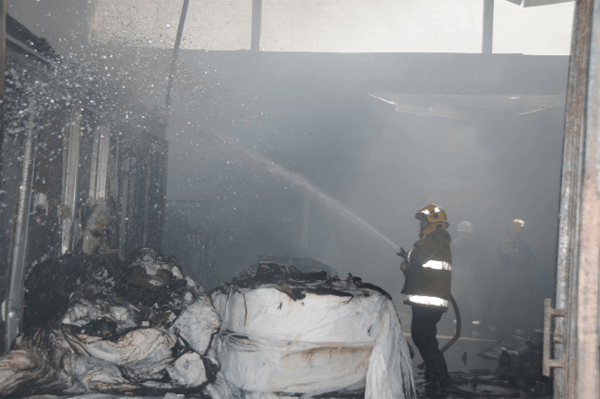 أصيب رجلا إطفاء خلال مكافحة حريق ضخم شب في ورشة تغليف محارم ورق تبلغ مساحتها حوالي 400 متر مربع في صناعية الصليبية.