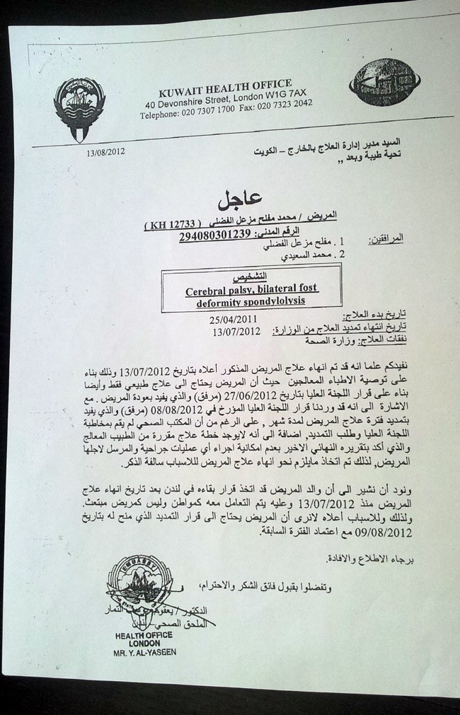 وجدد الفضلي نداءه إلى سمو الشيخ جابر المبارك متمنياً عليه أن يعطي توجيهاته باستكمال علاج ابنهم (محمد) الذي يواجه مصير العودة إلى “المربع الأول” بعد أكثر من 18 شهراً قضاها في العلاج بعيداً عن أهله ووطنه.