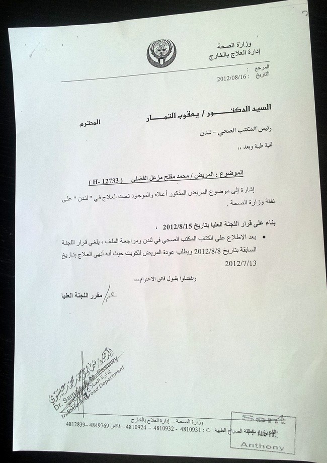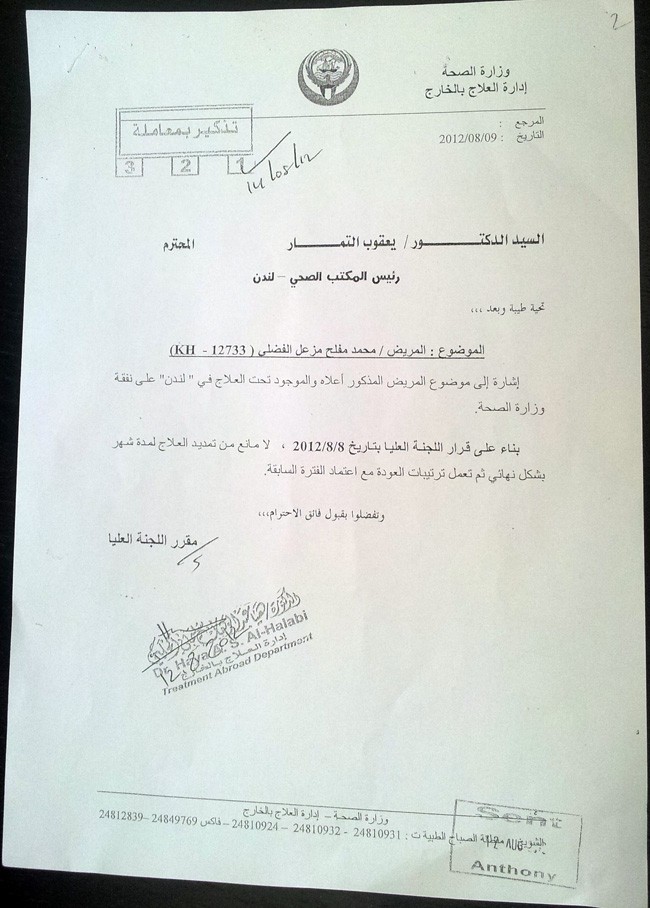 والغريب في الأمر – حسب إفادة مشعل الفضلي (عم المريض) أن مدير المكتب الصحي هناك رفض قرار اللجنة بينما هو متواجد في الكويت، الامر الذي يثير الكثير من علامات الاستفهام حول أوضاع المكتب، ومدى “مشروعية” القرارات التي يصدرها.