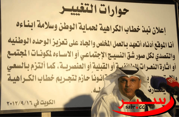 ومن ضمن فعاليات اليوم لشباب “حوارات التغيير”.. كان هنالك إعلان توقيع لنبذ خطاب الكراهية لحماية الوطن وسلامة أبنائه، والذي نصّ (أنا الموقّع أدناه.. اتعهد بالعمل المخلص والجاد على تعزيز الوحدة الوطنية والتصدي لكل صور شق النسيج الاجتماعي أو الإساءة لمكونات المجتمع أو إثارة النعرات الطائفية أو القبيلة أو العنصرية، كما التزم بالسعي والاستعجال بالحث على إصدار قانون حازم لتجريم خطاب الكراهية، بما لا يتعارض مع الحريات المسؤولة.. الكويت في 16/9/2012 ).. وتم التوقيع على خطاب نبذ الكراهية من الحضور من شباب الحراك السياسي وعدد من نواب الأمة مثل النائب مسلم البراك، د. خالد شخير ، خالد الطاحوس ، علي الدقباسي ، صيفي مبارك الصيفي ، حمد المطر ، اسامة الشاهين . وعدد من الكتاب والصحفيين والأكاديميين.