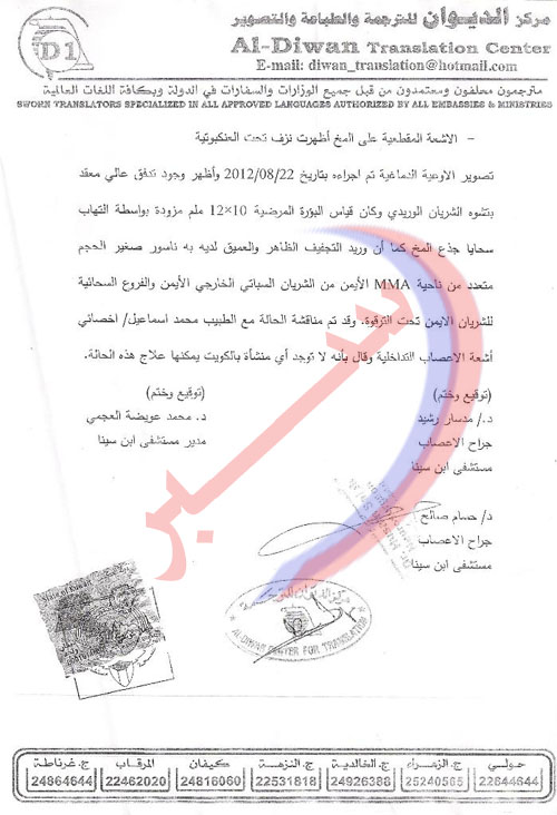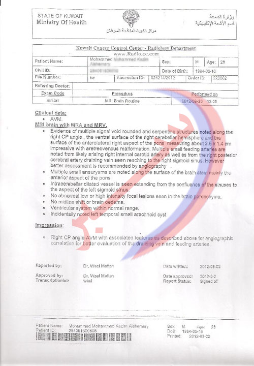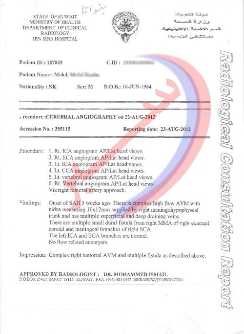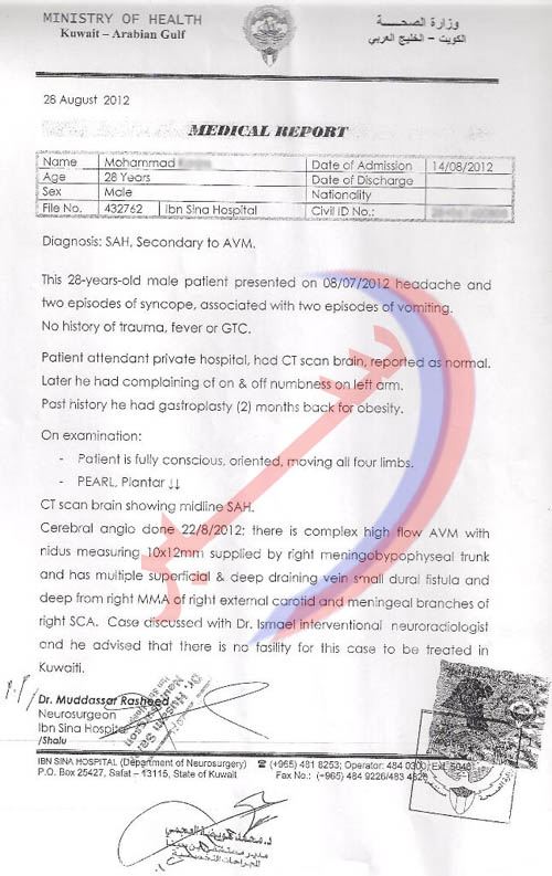 اضطر “محمد” إلى أن ينتقل لأحد المستشفيات الخاصة الذي تكلّف علاج باهض قرابة 1600 دينار، مما أهلك ميزانيته هو ووالدته الكويتية المعاقة، وذلك أن والده أيضًا يعاني من إعاقة جسدية وعندما قام احد اخوته بأخذه إلى أحد الاطبة الاجانب الزائرين لمستشفى ابن سينا.. فصعق الدكتور الزائر، وقال بأنه يعاني من نزيف تحت العنكبوتية كعرض ثانوي لتشوّه الشريان الوريدي في الدماغ، ونقل فورًا إلى الجناح، وفي محاولة لعمل قسطرة له تعذرت وذلك لصعوبتها وأفاد بعدها تقرير وزارة الصحة ان علاج محمد غير متوفّر في الكويت، ولابد من عمل مثل هذه الجراحات في احدى المستشفيات المتقدمة في الخارج.