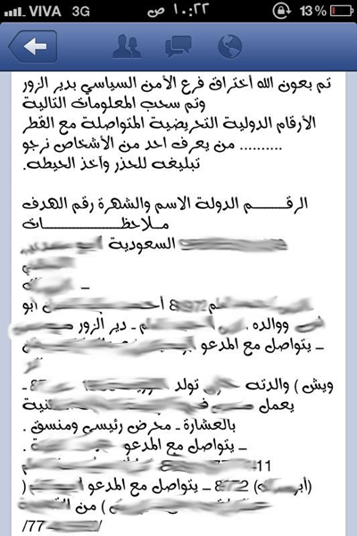 ووجدت الوثائق في مبنى الأمن السياسي في محافظة دير الزور السورية بعد سيطرة الجيش الحر عليه، وفيها أسماء عدد من الكويتيين والسعوديين بالإضافة إلى آخرين من دول خليجية أخرى، وأمام كل اسم رقم الهاتف الذي يستخدمه وكذلك الاسم الحركي لبعضهم.