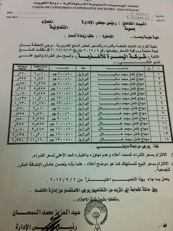 بالمستندات اثبت  عضو مجلس ادارة جمعية العدان و القصور سالم حسين الشعشوع  ان اتحاد الجمعيات التعاونية يساهم في ارتفاع الاسعار بدلا من تخفيضها حيث نشر الشعشوع كتابا مفصلة فيه اسعار دجاج ساديا ودجاج هلال المستوردين من البرازيل بأسعار مرتفعة عن السابق .