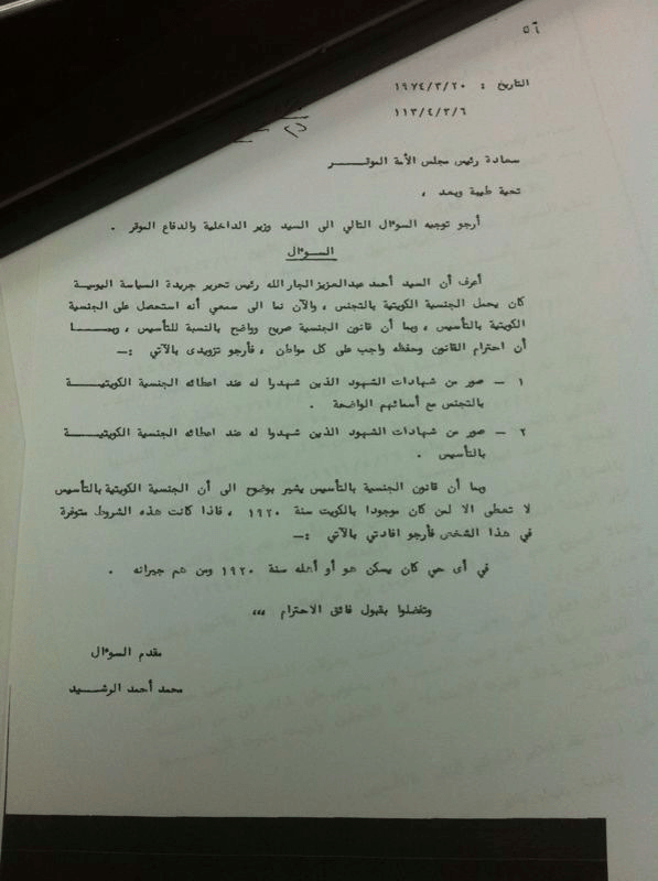 ولعل أبرز ما كان وسيظل شاهداً على نقاء تلك الفترة وخلوها من “الشوائب” ذلك السؤال الذي حصلت عليه سبر وكان موجها من النائب السابق المرحوم محمد أحمد الرشيد (والد الوزير السابق أنس الرشيد) إلى وزير الداخلية المغفور له الشيخ سعد العبدالله الصباح عام 1974.. والسؤال كان متعلقاً بتحويل جنسية رئيس تحرير جريدة السياسة أحمد عبدالعزيز الجارالله من “التجنيس” إلى “التأسيس”وكذلك إجابة الوزير على السؤال.